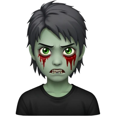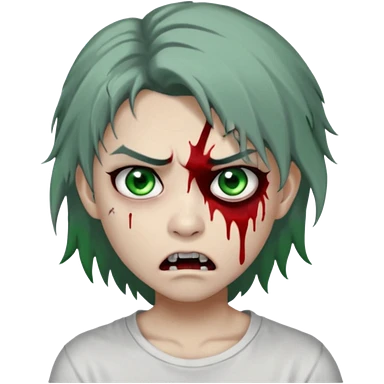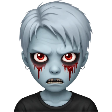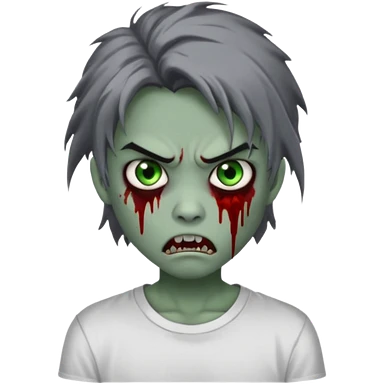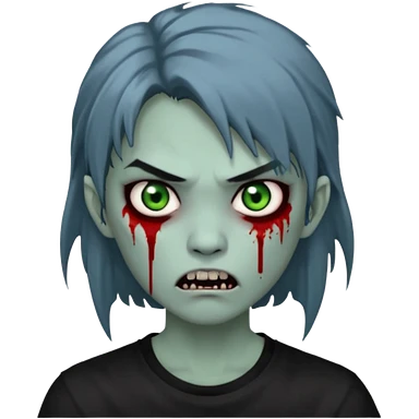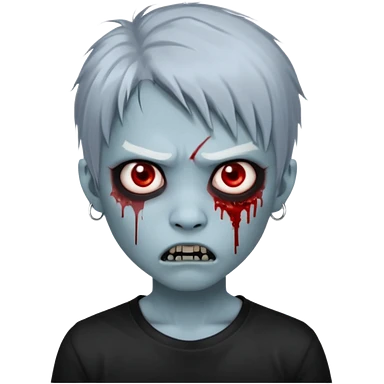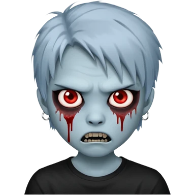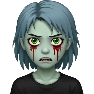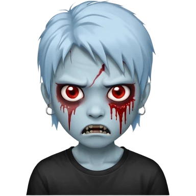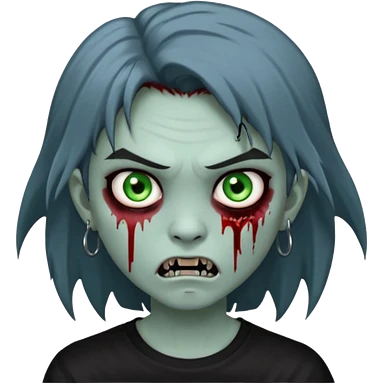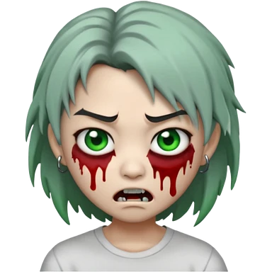 3D emoji-style avatar with grey zombie skin, dark brown hair, a young Asian face, and large green eyes with blood tears. Give it white litle bit messy mullet hair style , silver hoop earrings, and a plain black T-shirt. The face expression should be slightly angry, with vampire fang emoji | AI Emoji Generator
