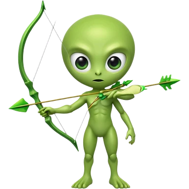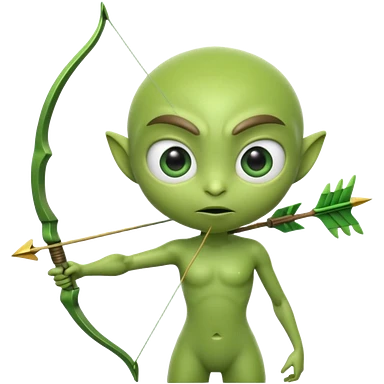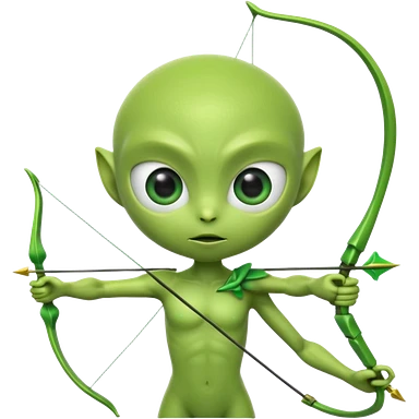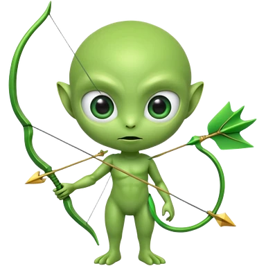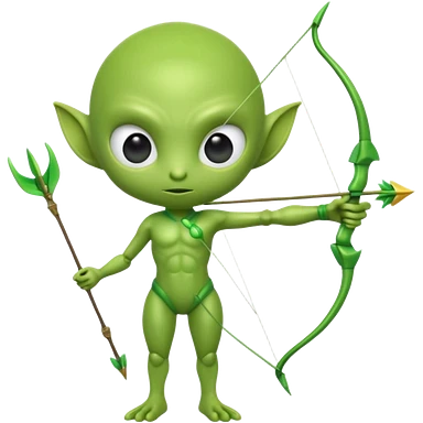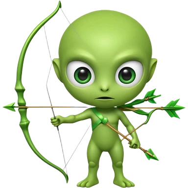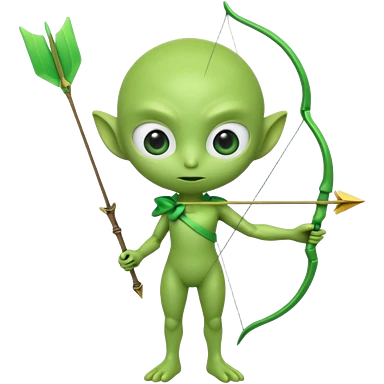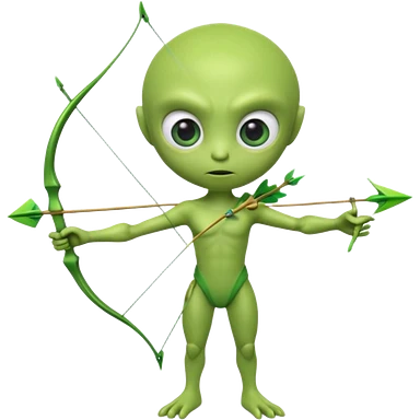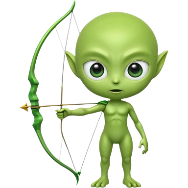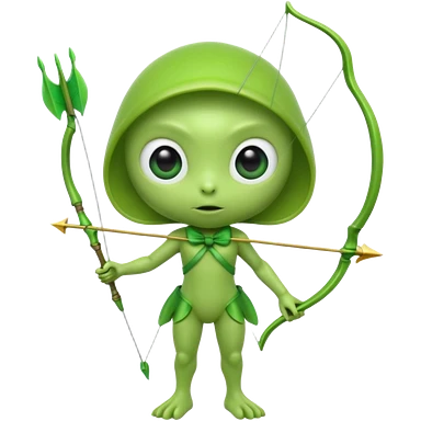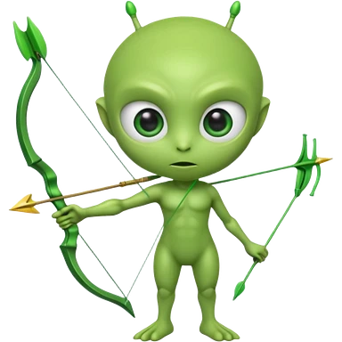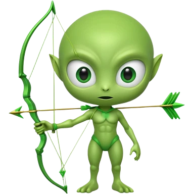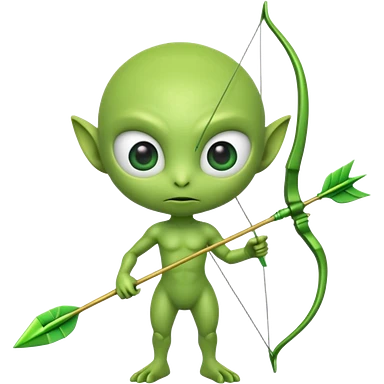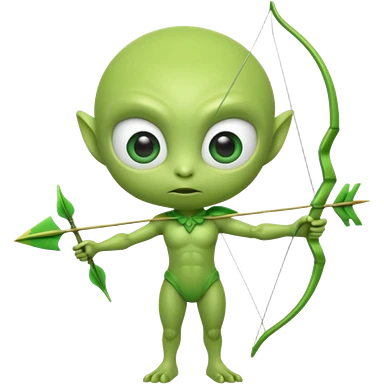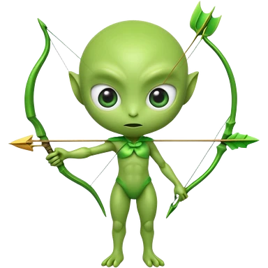 3D emoji-style green alien holding a bow and arrow, glossy texture, smooth skin, large expressive eyes, small humanoid body, minimalist background, soft lighting, Pixar-style rendering, high detail, cute but slightly serious expression, clean centered composition.emoji