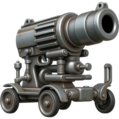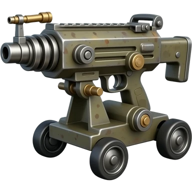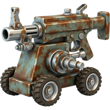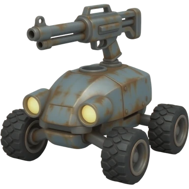 rusty machine on four wheels, glowing round headlights, gray metal with rust, soft lighting, clean background, it has a minigun emoji