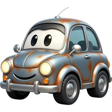 Cute 3D emoji-style rusty machine on four wheels, glowing round headlights, toy-like, gray metal with rust, soft lighting, clean background emoji