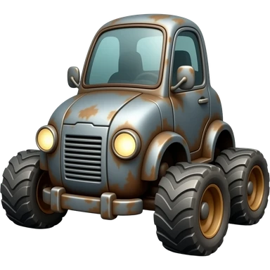 3D emoji-style rusty machine on four wheels, glowing round headlights, gray metal with rust, soft lighting, clean background emoji