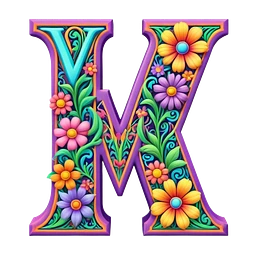 3D, gothic style psychedelic colored Letter W with hippie style flower border emoji