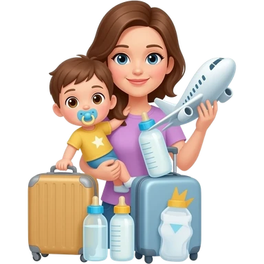3D emoji style, woman with child, suitcase, airplane, baby items, bright colors, minimal background, no text emoji