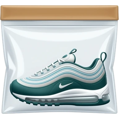 3D render of haki Nike Air Max 97 sneaker profile inside clear vacuum zip-lock bag with tan liner. emoji