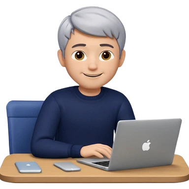 3D Memoji of the man from the photo, short salt-and-pepper hair, dark navy sweater, sitting with a silver laptop, Pixar style, white background, professional smile emoji