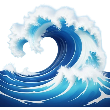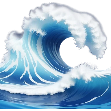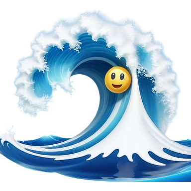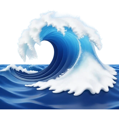 3D render of Tsunami, miniature weather phenomenon, volumetric particle effects, giant curling wave of deep blue water with white foam, emoji style, isolated on white background --v 6.0. emoji