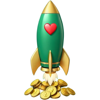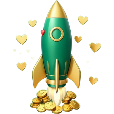 3D rocket with coins and hearts, deep green color (#0B3D2C), gold accents (#C9B037), cream highlights, glossy modern style, transparent background emoji