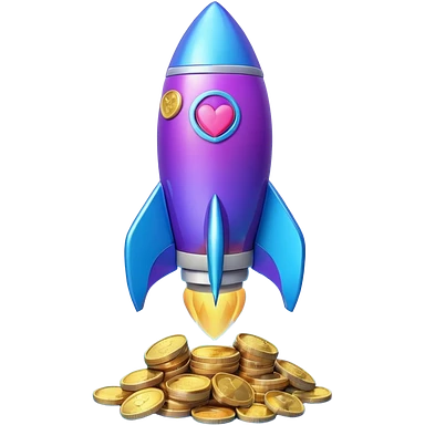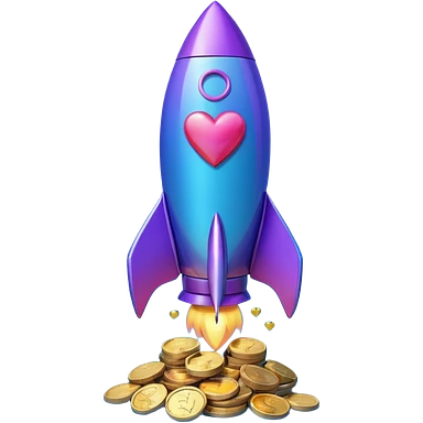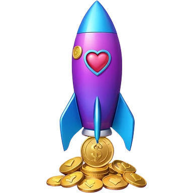 3D rocket with coins and hearts, purple blue gradient, glossy, transparent background emoji | AI Emoji Generator