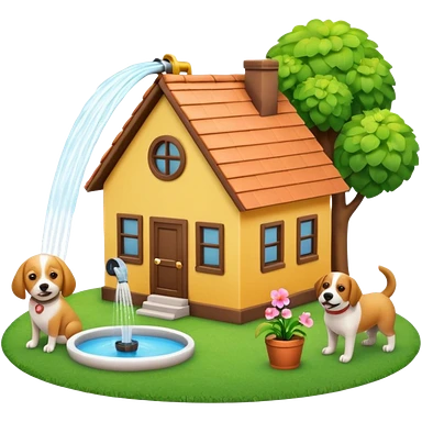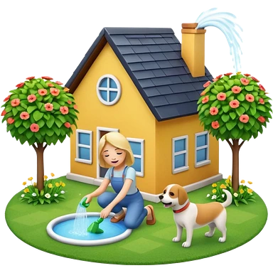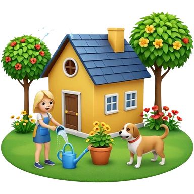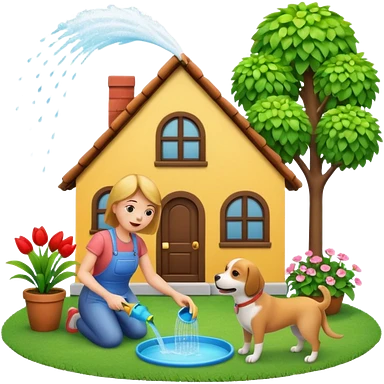 Make a 3D emoji Illustration of A house and there is a woman watering her plants while a dog is playing around on the grass emoji