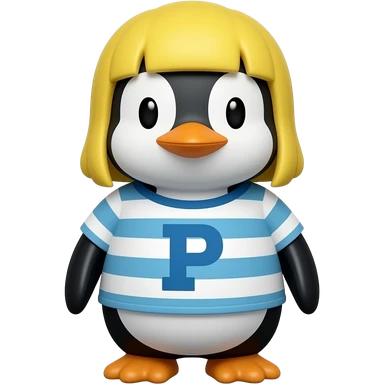 Pecola (Make a cubic penguin with yellow hair and striped shirt with the letter "P" on it. Two colors of his striped shirt are white and blue. His feathers are black and his beak and feet are orange.) emoji