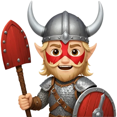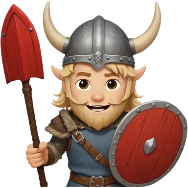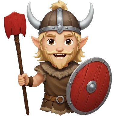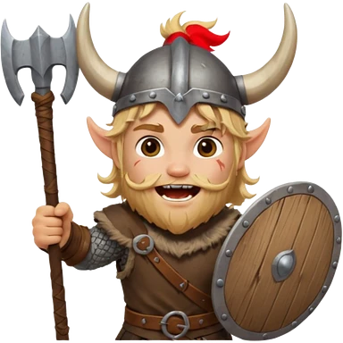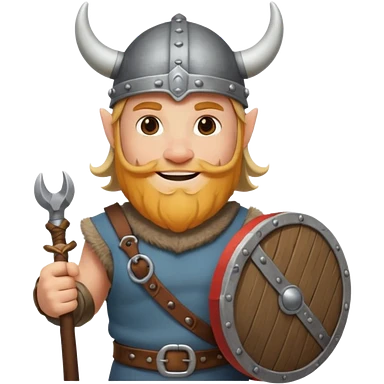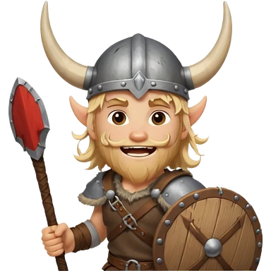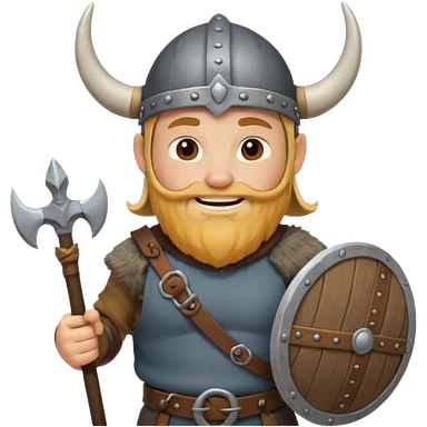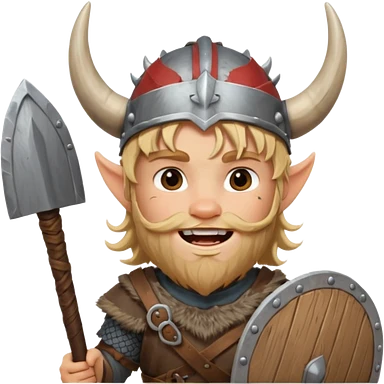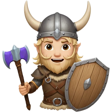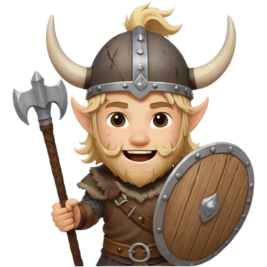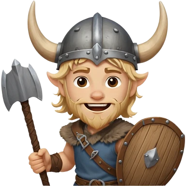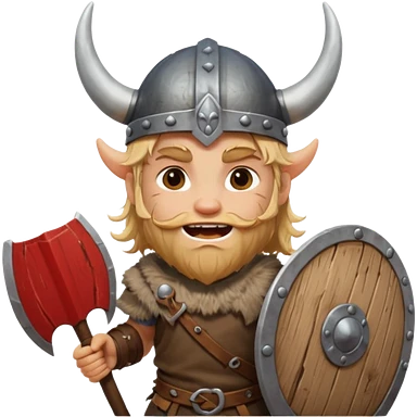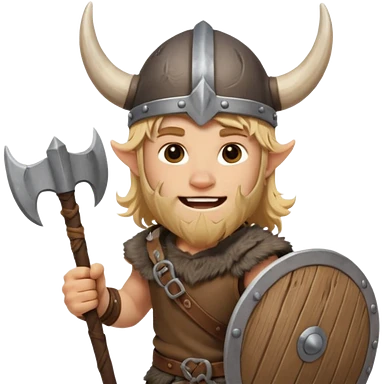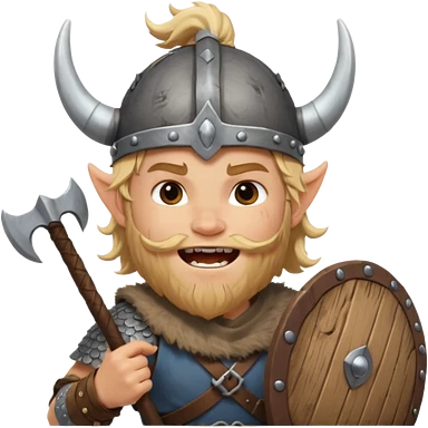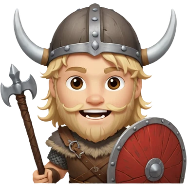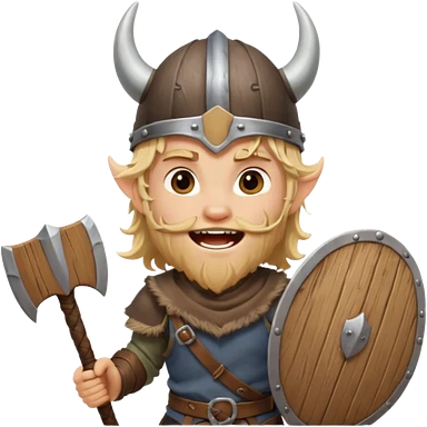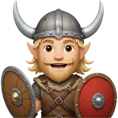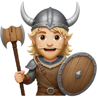 A young Viking warrior with messy blond hair, wooden shield, and fierce excited grin with horned helmet emoji