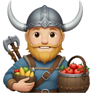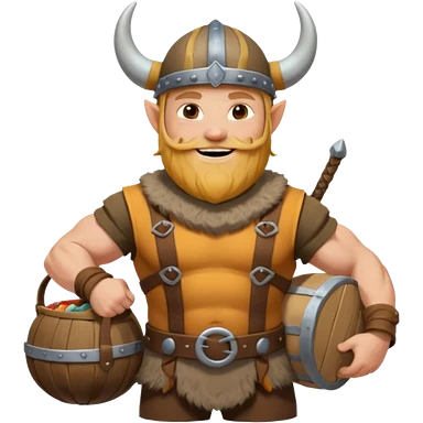 A jovial Viking with round belly, horned helmet, and hearty smile while carrying supplies. emoji