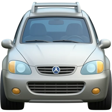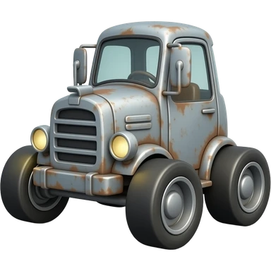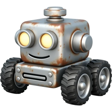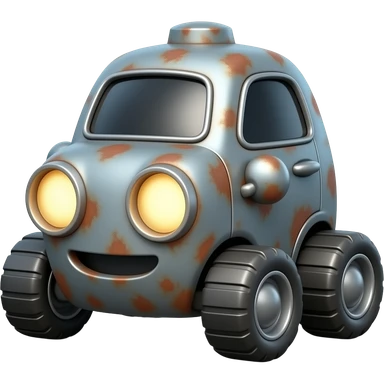 3D emoji-style rusty machine on four wheels, glowing round headlights, gray metal with rust, soft lighting, clean background emoji