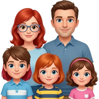 a mom dad with 6 kids 4 girls 2 boys and older sister with red hair and clar glasses a 10 year old brother with brown hair a 7 year old sister with red hair a 5 year old brother with red hair a 3 year old sister with short curly red hair and a 1 year old girl with brown hair emoji