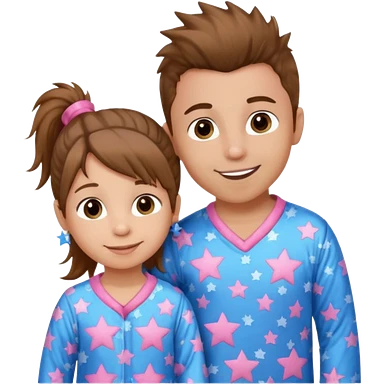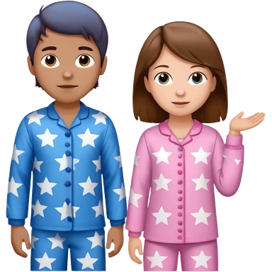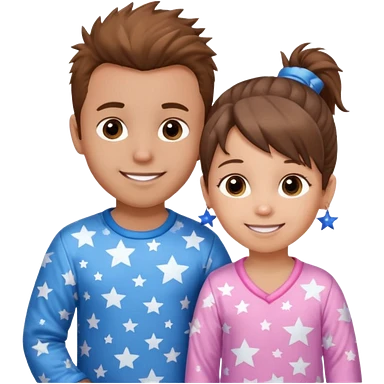 4 year old brown spikey haired boy with blue pajamas with stars on them and a 1 year old brown haired pony tail girl with pink pajamas, and stars on them with light skin. Top left on, can you make them smile more with lighter skin emoji | AI Emoji Generator
