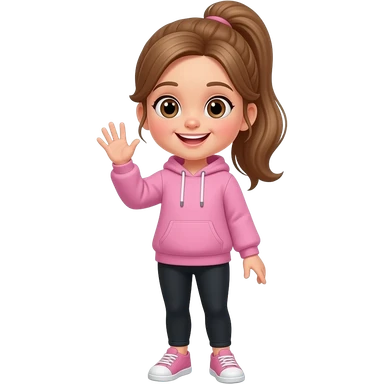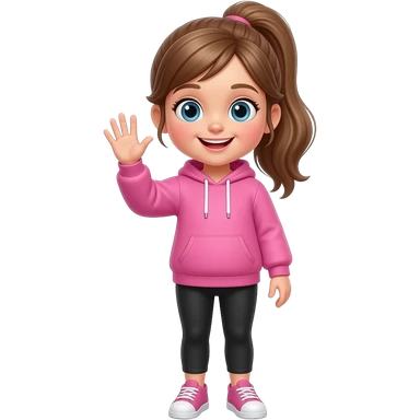 5 year old girl with long light brown hair in a half ponytail wearing black leggings and a pink sweatshirt waving hello emoji