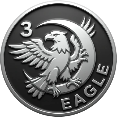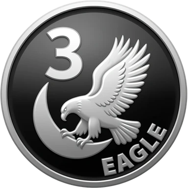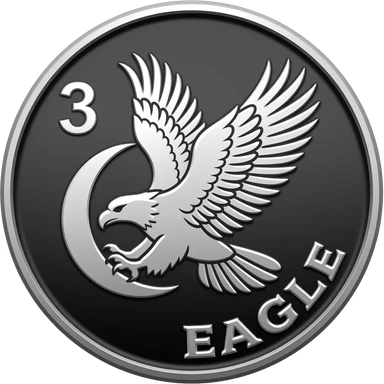 Silver metallic coin medallion, black background, bold engraved style, number ‘3’ in top left, central design of a majestic eagle in flight embracing a crescent moon with its wings, strong black outlines and shading, word ‘EAGLE’ in bottom right, emoji