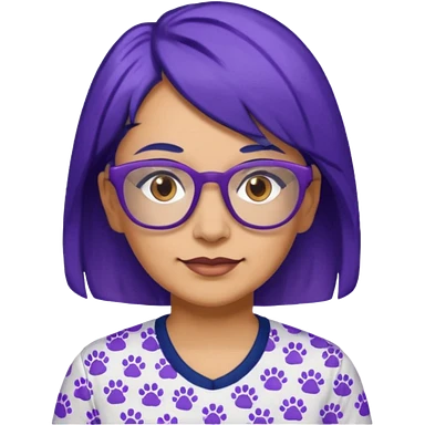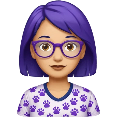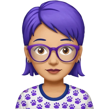 50-year-old woman with hair that is navy blue, purple glasses, and brown eyes, in a shirt with small pawprints all over it. emoji