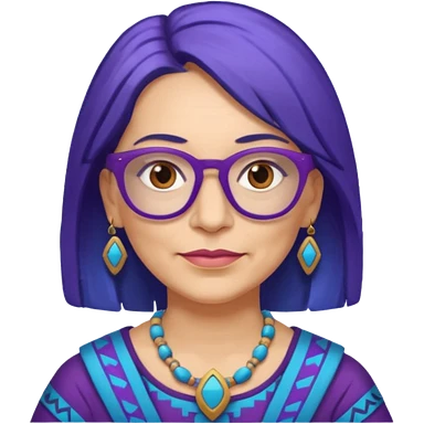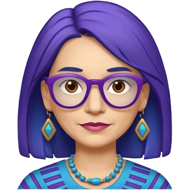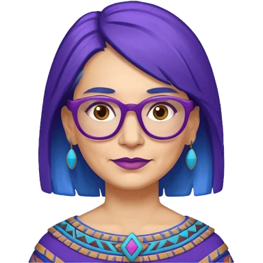 50-year-old woman with purple glasses, brown eyes, and Aztec blue shoulder-length hair emoji
