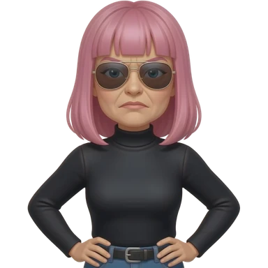 Pissed off 50 year-old woman with pink jaw lenght hair and bangs wearing aviator sunglasses and hands on hips and a black turtle neck emoji