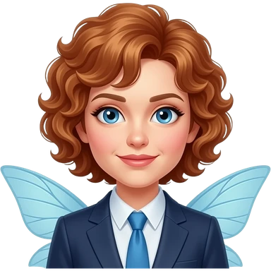 50 yr old petite femaile with blue eyes and pixie style curly hair auburne as the office fairy emoji