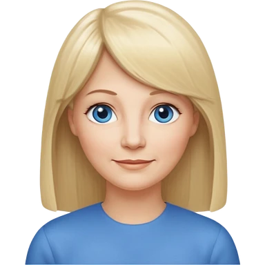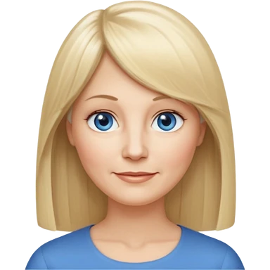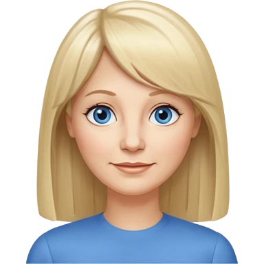 50 yr old white woman, center parted hair with bangs, very long straight blond hair, oval face, small smile, blue eyes, thin face, hair downback, hair parted at center of head, round cheeks, pale, longer hair, white shirt emoji | AI Emoji Generator