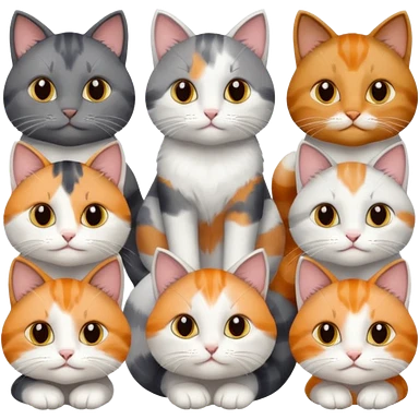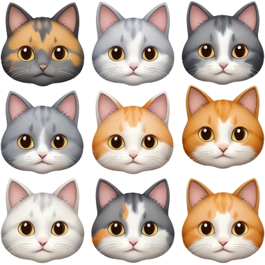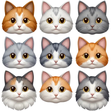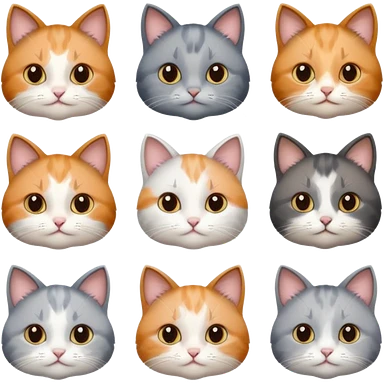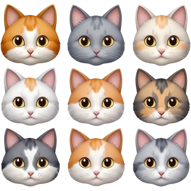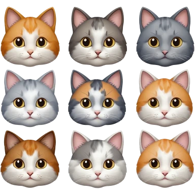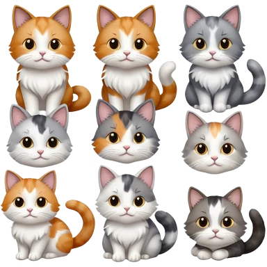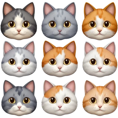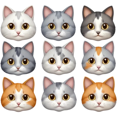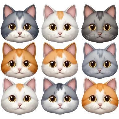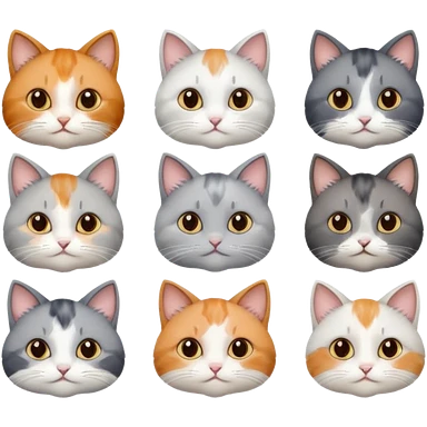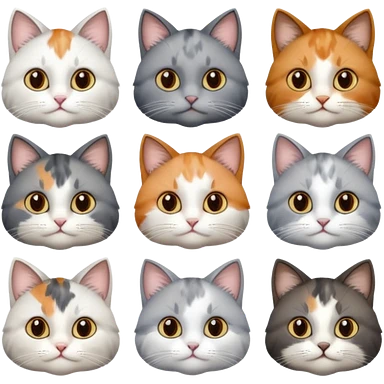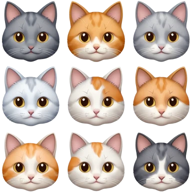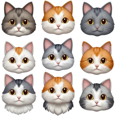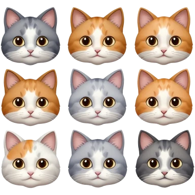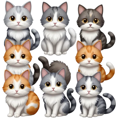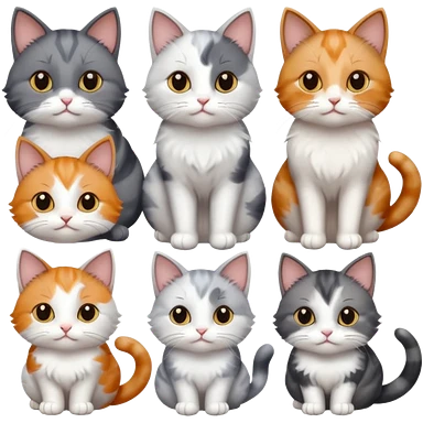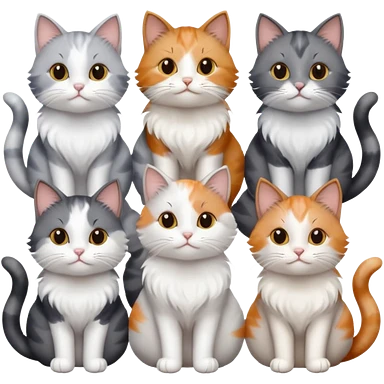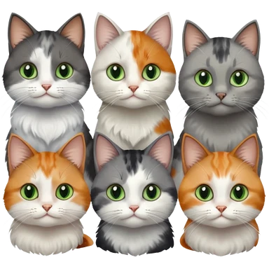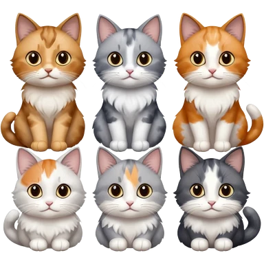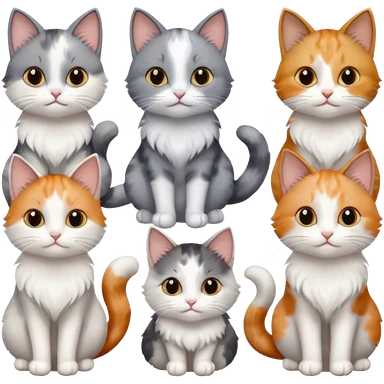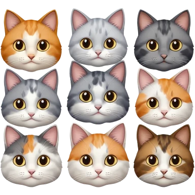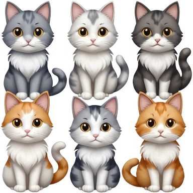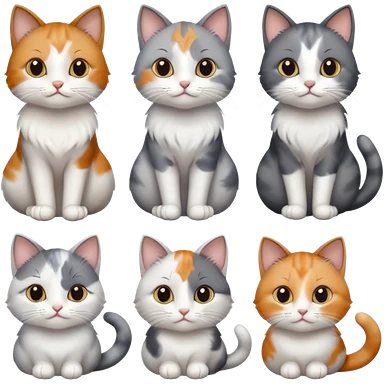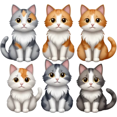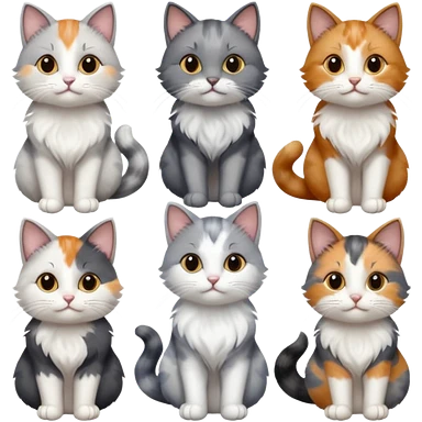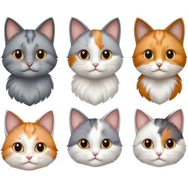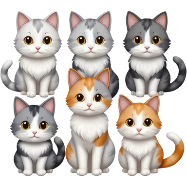 6 realistic looking cats with different natural coloured coats, assorted grey and white, greys, calico, brown and white colours etc emoji