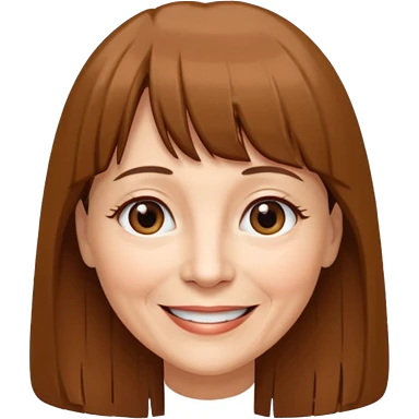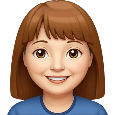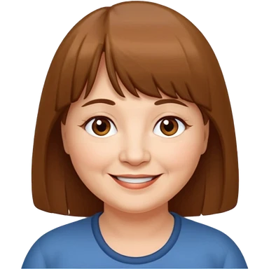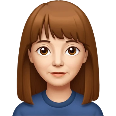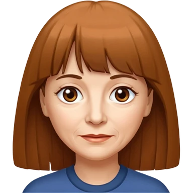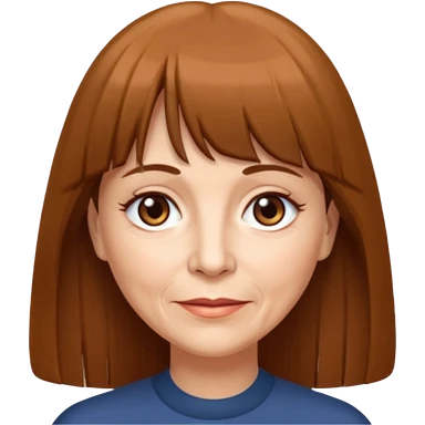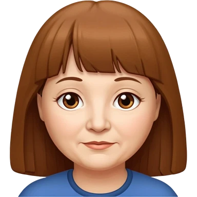 60 yr old woman, blue green eyes, long straight dark brown hair, business shirt, chubby, bangs emoji | AI Emoji Generator