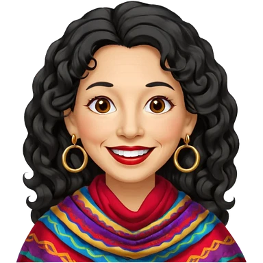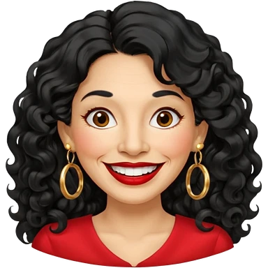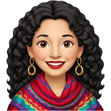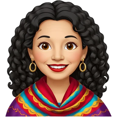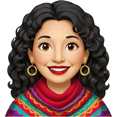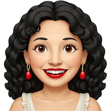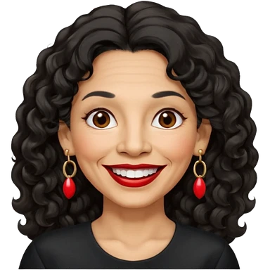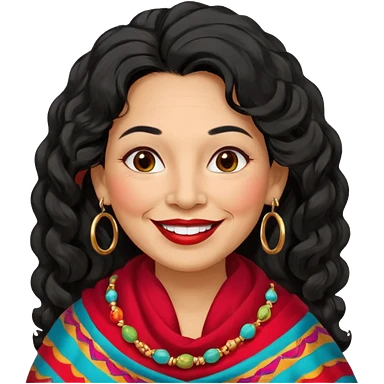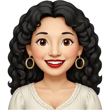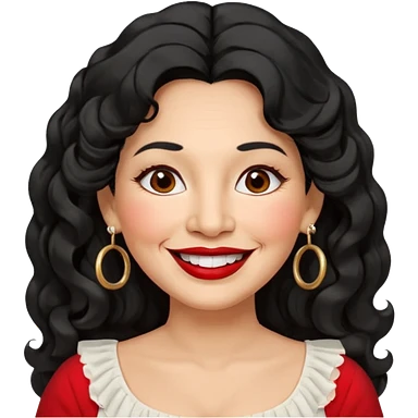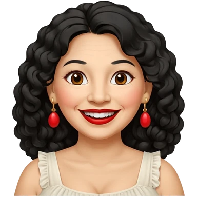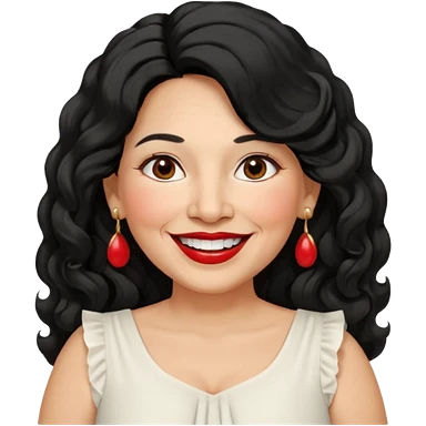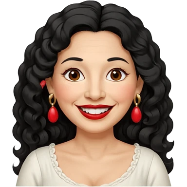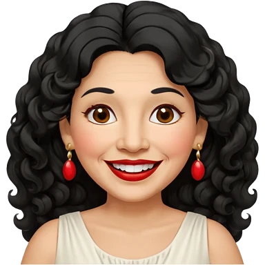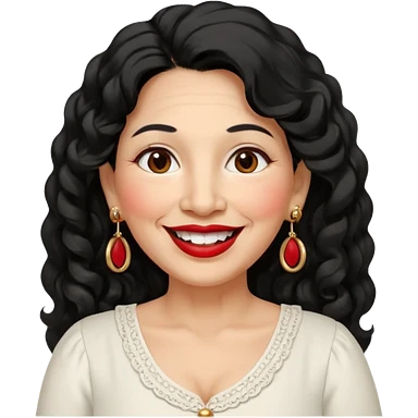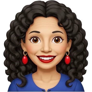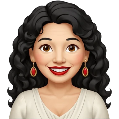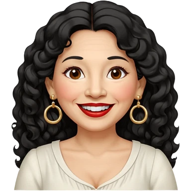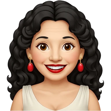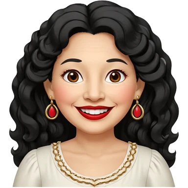 60 yr old woman, long hair to waist, very small brown eyes, long hair, straight dark brown hair, bangs, chubby, long face, very tired but happy emoji | AI Emoji Generator