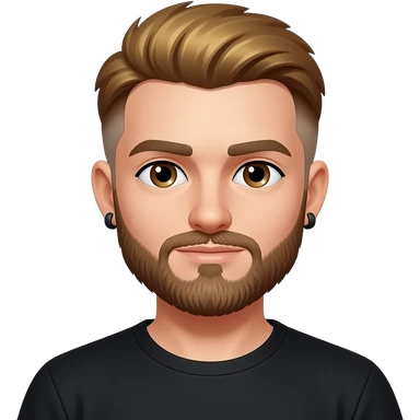 8-BitRyan with brown eyes, one side golden brown hair, one side buzz cut, brown short beard, black t-shirt, black earrings emoji