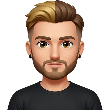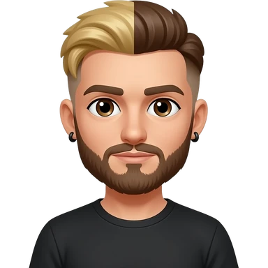 8-BitRyan with brown eyes, one side blonde hair, one side brown buzz cut, brown short beard, black t-shirt, black earrings emoji