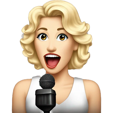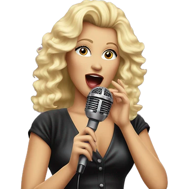 Singer female with blond hair big volume 80's style, singing on the stage with microphone. Retro rock 80-90's emoji