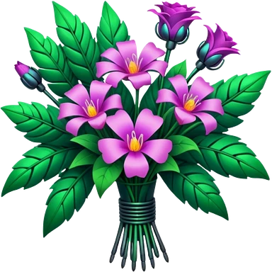 8k.quailty oversized beautiful, vivid? Different shaped, different types, glowing detailed cyberpunk style bouquet of flowers. Must have lush green leaves. Clean thin lines, smooth appearance, no emoji icons, no background, isolated, rendering. emoji | AI Emoji Generator