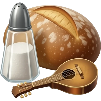 a bottle of salt (salt shaker) and a loaf of peasant bread with a small mandolin - still life composition vintage emoji