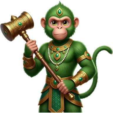 Angada, the green monkey warrior prince, standing arrogantly, holding a mace, intricate gold jewelry, defensive stance, aura of zone control, ancient jungle temple background. emoji