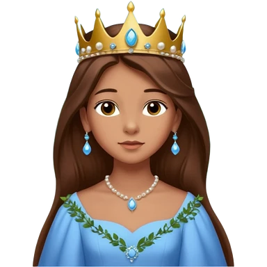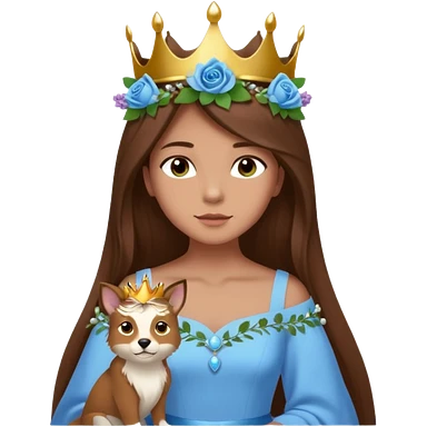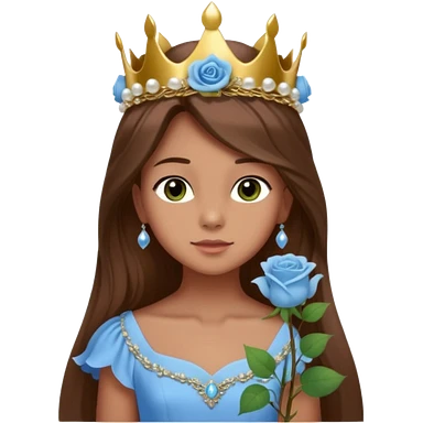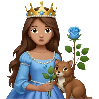 a 12 year old girl with shinny long brown hair and pretty green eyes with pale skin wearing a sky blue gown in a beautiful forest with adorable animals and stunning roses and lilacs surrounding her as she smells the only sky blue rose she is also wearing a crown that has pearlsemoji