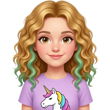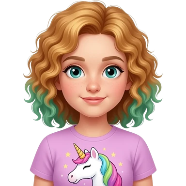 a 13 year old girl with golden redish green highlights curly hair unicorn shirt emoji