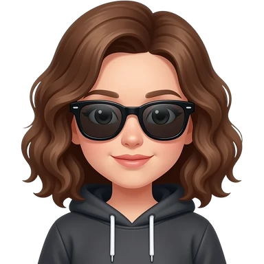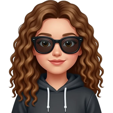 a girl with pale skin, curly longbrown hair and wayferer sunglasses with black frame. who wears a hoodie emoji