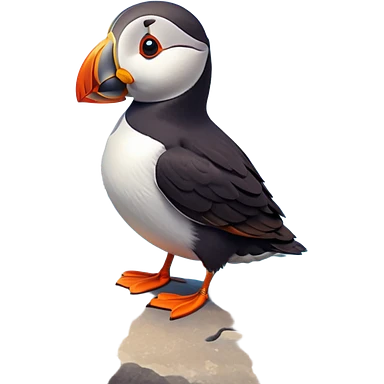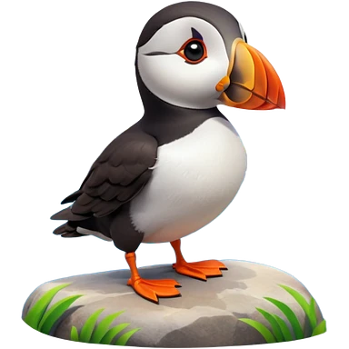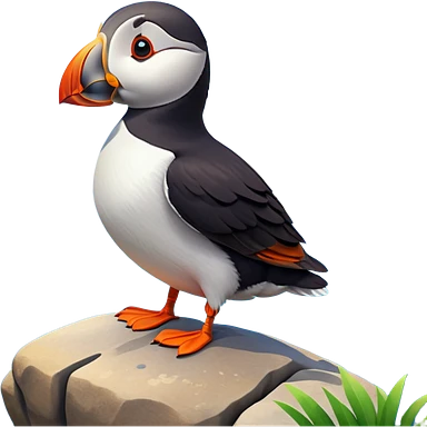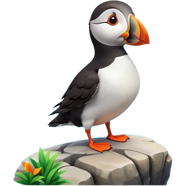 A 3D cartoon puffin bird standing on a rock near the sea, soft daylight, bright colors, realistic Memoji-style. emoji