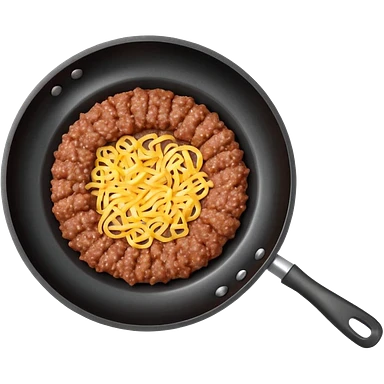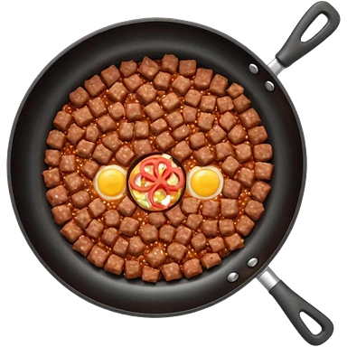 A 3D cartoon frying pan with minced meat being cooked, top view, realistic texture, Memoji-style. emoji