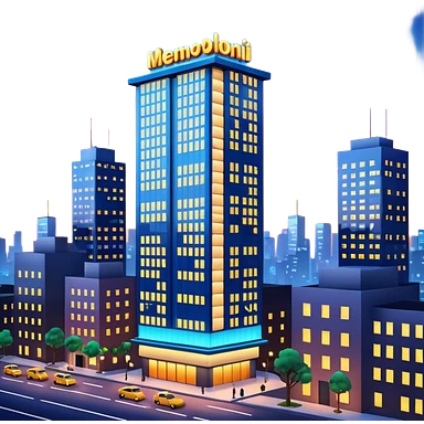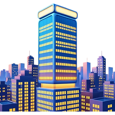 A 3D cartoon city billboard mounted on a tall building, glowing lights at dusk, realistic reflections, Memoji-style. emoji