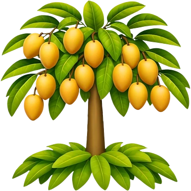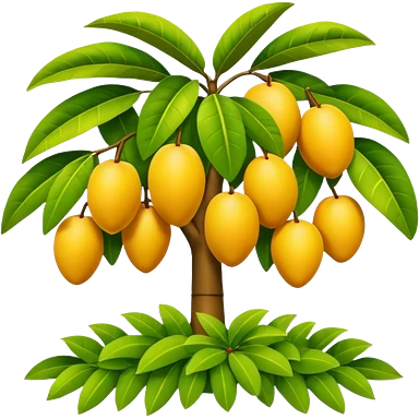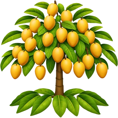 A 3D cartoon mango tree with golden-yellow mangoes visible among dense leaves, sunny atmosphere, Memoji-style rendering. emoji | AI Emoji Generator