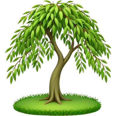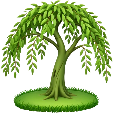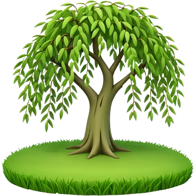 A 3D cartoon willow tree with drooping green branches over soft grass, natural sunlight, Memoji-style rendering. emoji