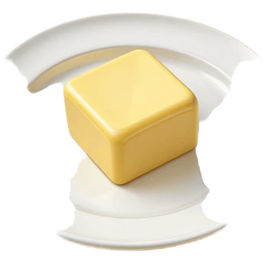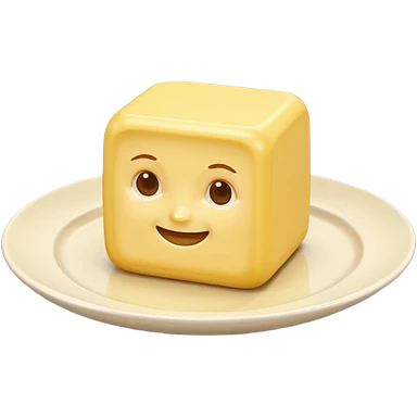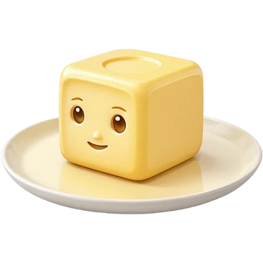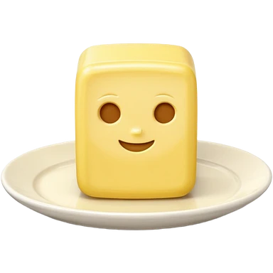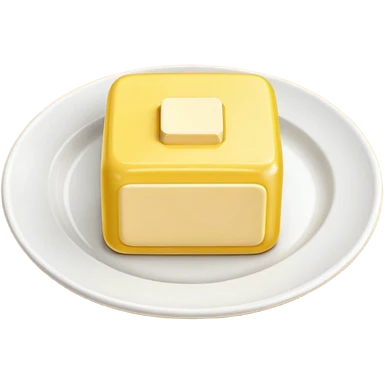 A 3D cartoon yellow butter block on a white ceramic dish, soft lighting, Memoji-style realism. emoji