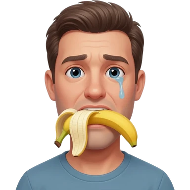 thirty year old guy with his mouth filled by a huge peeled banana drooling from one side of his mouth and tear in one eye emoji