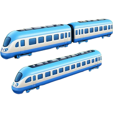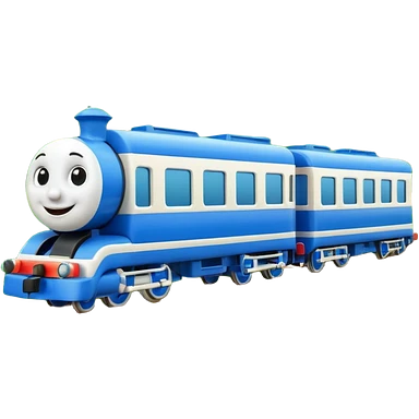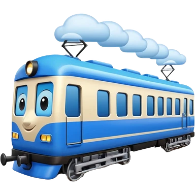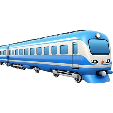 A 3D cartoon sleek white bullet train on tA 3D cartoon passenger train with blue carriages and visible windows, moving through countryside, Memoji-style.racks, high-speed motion blur, clean lighting, Memoji-style realism. emoji | AI Emoji Generator