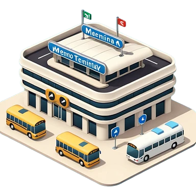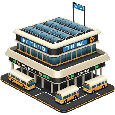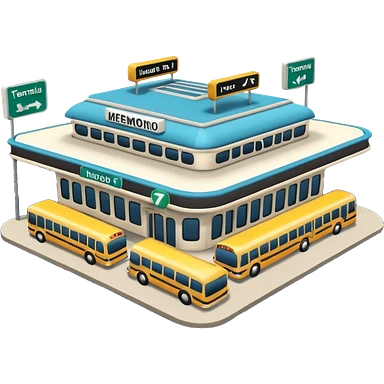 A 3D cartoon bus terminal with multiple buses parked, roofed structure, and directional signs, Memoji-style. emoji