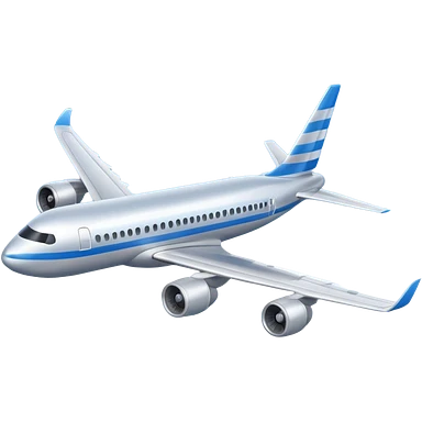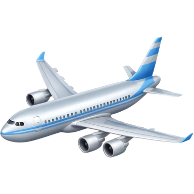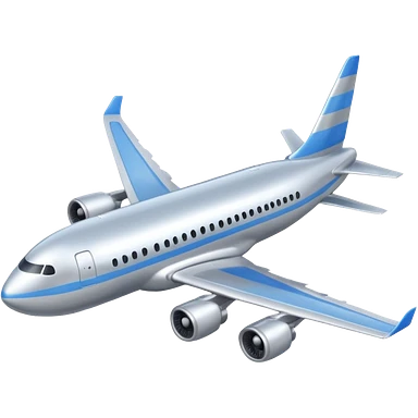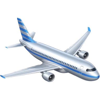 A 3D cartoon commercial airplane flying above clouds, silver body with blue stripes, smooth reflections, Memoji-style realism. emoji