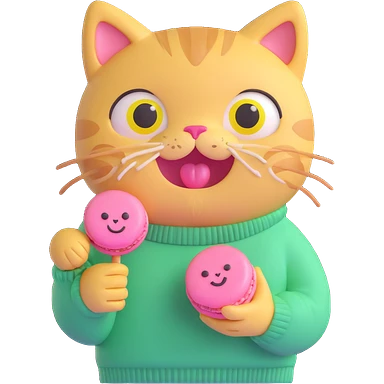 A 3D iOS style emoji of a pink macaron with a strawberry on top and three cute animals peeking out from between the layers. The macaron should have a glossy finish and soft shadows, with a light yellow background and small yellow stars scattered around.emoji