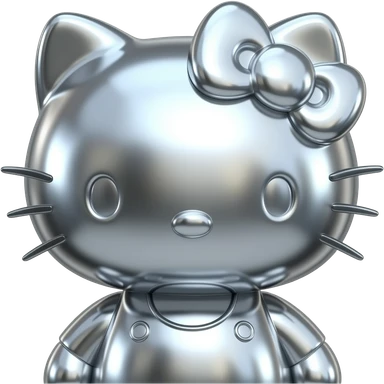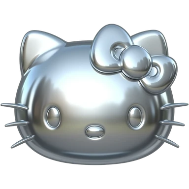 A 3D Y2K-style hello kitty made of liquid chrome and polished silver. Sharp edges with a high-gloss metallic finish reflections. Minimalist, futuristic, and moody emoji